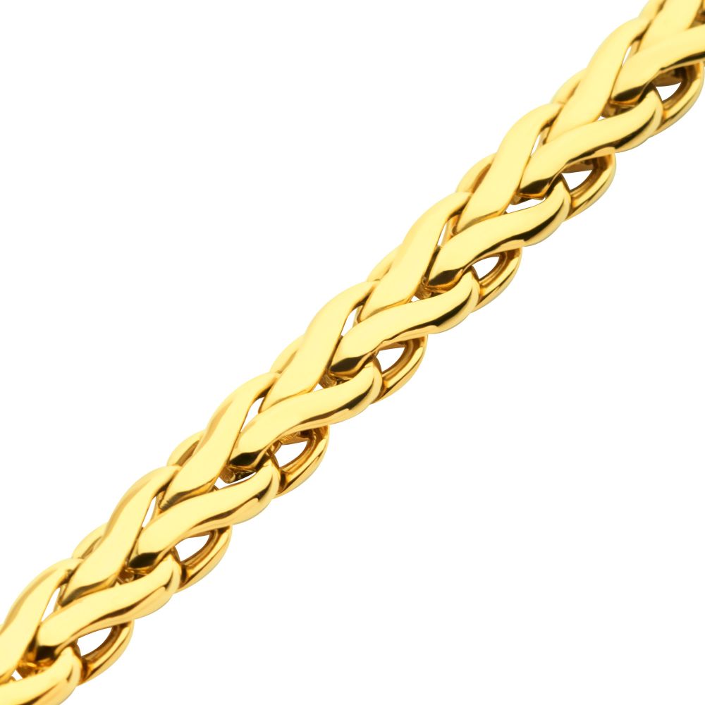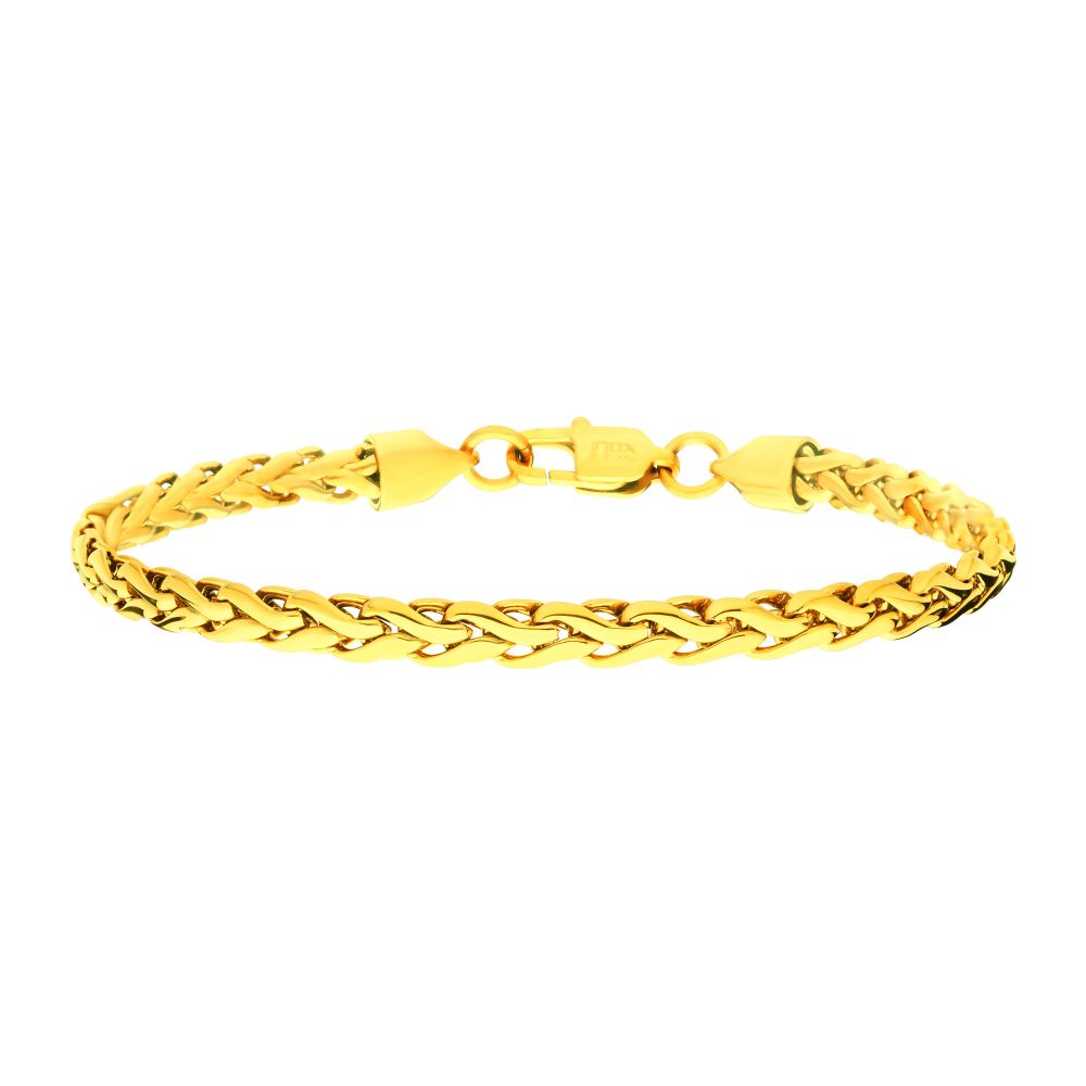 This 5mm spiga chain bracelet is crafted from durable stainless steel and finished in rich 18KT gold IP with a high-polish shine. The woven spiga design delivers depth and strength, creating a timeless bracelet built for everyday wear.