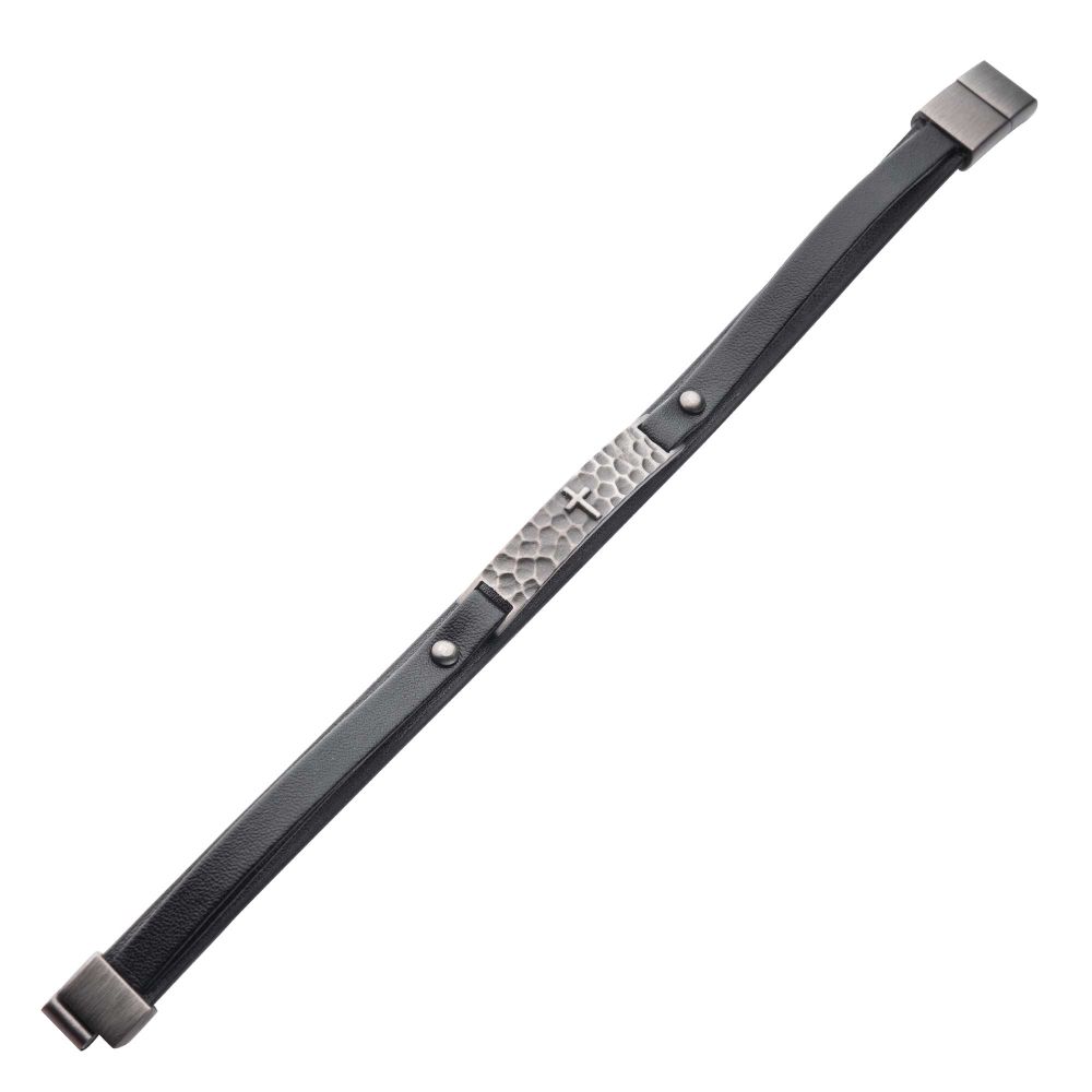 This men’s bracelet features black leather straps paired with a stainless steel ID plate showcasing a hammered cross design. Crafted for durability and everyday comfort, it delivers a bold expression of faith with a rugged, masculine edge.