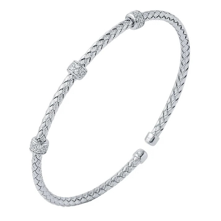 A clean, everyday cuff with subtle sparkle. This open bangle features a 3mm woven mesh in polished sterling silver, finished with evenly spaced pavé CZ stations and smooth end caps. Flexible enough for an easy on/off fit, it looks refined solo and pairs perfectly in a stack.
