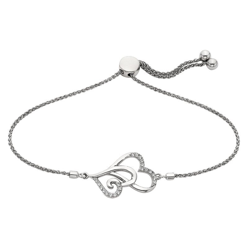 Delicate and sparkling, this sterling silver bolo bracelet features two intertwined hearts accented with brilliant white topaz stones. The adjustable chain ensures a perfect fit, making it a meaningful and versatile piece for everyday wear or special occasions.