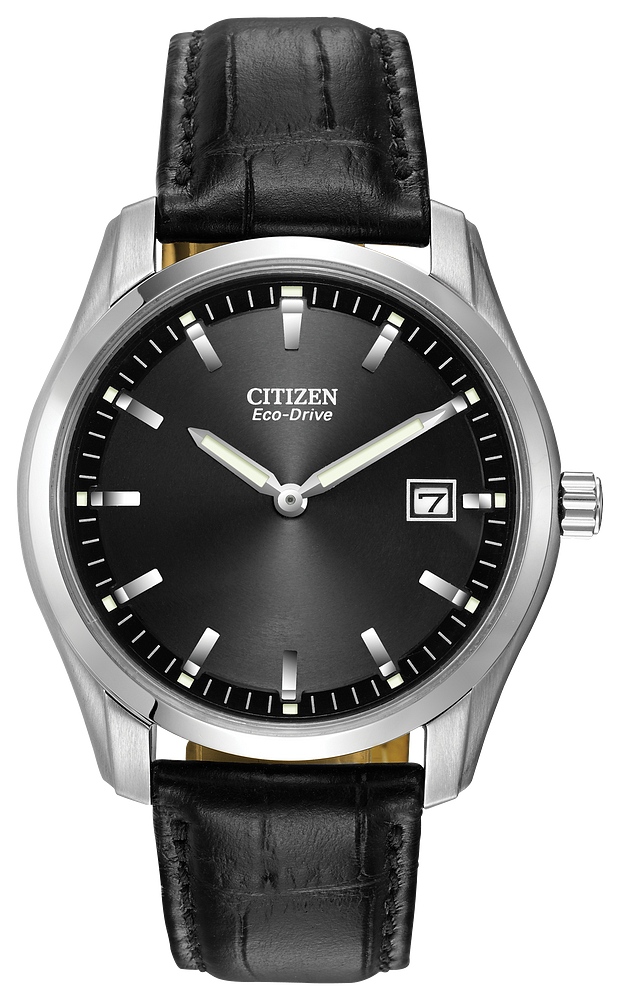 A watch like this says you mean business. Crafted in stainless steel with a black dial, luminous hands, date indicator and sophisticated black leather strap. Featuring our Eco-Drive technology – powered by light, any light. Never needs a battery. Caliber number J165.