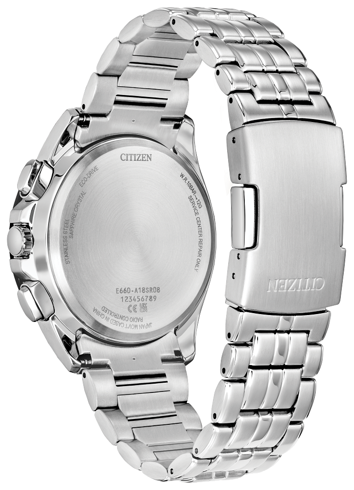 • Inspired by the beautiful oceans that unite the world, the watches of Citizen's UNITE with BLUE series join the colors of the seven seas on one 100% recycled polycarbonate dial. This Limited Edition model comes as part of the PCAT collection, marking a unique take on the cutting-edge style. The sharp chronograph features a silver-tone stainless steel case measuring 43mm in diameter. Secured to the wrist via a matching 5-link bracelet, this striking timepiece also features an outer tachymeter and inner world time-equipped bezels that hint at the elevated technological capabilities of the watch, while a duo of stepped chronograph pushers and crown guards provide a sleek and sporty touch. On the ocean-inspired dial, a three-register chronograph is at work, with touches of greens, purples, and blues adding wave-like dimensionality alongside the utility of a day and date display. Other advanced features include atomic timekeeping technology with synchronized time adjustment available in 24 time zones, a chronograph measuring up to 60 minutes, a perpetual calendar, 12/24 hour time, an alarm, and a power reserve indicator. This high-performance men’s watch is sustainably powered by Citizen’s proprietary Eco-Drive technology, so it never needs a battery. Water resistant up to 100 meters. Caliber E660. Limited to 5,400 unnumbered pieces worldwide.