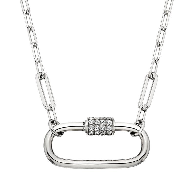 This modern charm holder necklace features a sleek carabiner-style center link accented with sparkling white topaz on a paperclip chain. Clip on your favorite charms to create a look that’s uniquely yours.