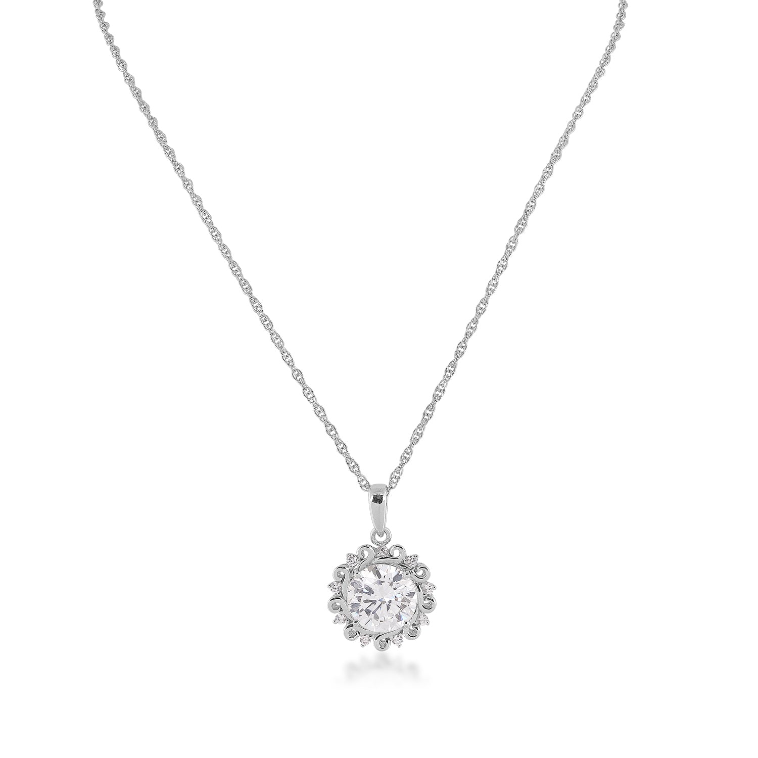Elegant and eye-catching, this Sterling Silver Rhodium-Plated Pendant features a brilliant 8mm white cubic zirconia center, surrounded by a halo of sparkling CZ accents. Delicate silver filigree swirls add a vintage-inspired, intricate touch, enhancing the pendant’s charm and sophistication.