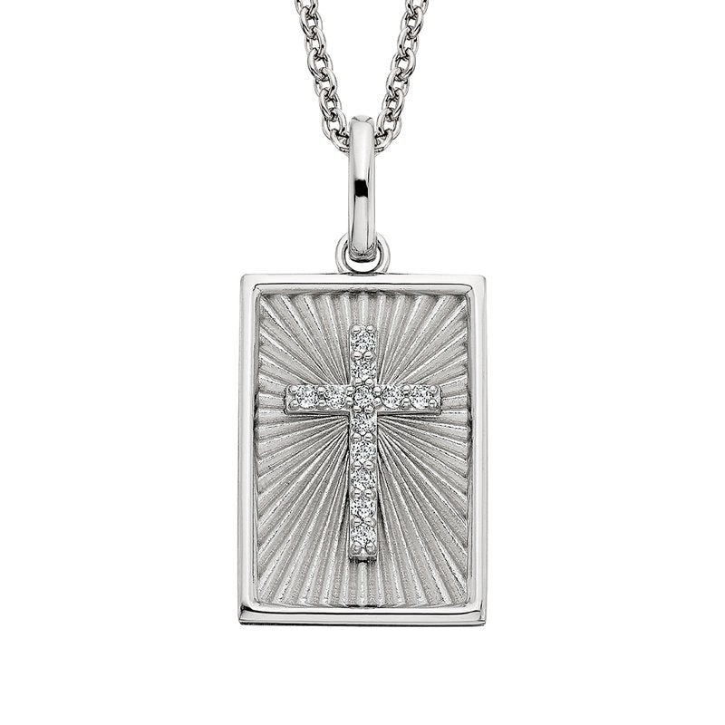 A contemporary take on a timeless symbol, this sterling silver pendant features a sparkling white topaz cross set against an engraved radiating background. Framed within a sleek rectangular design, it captures both modern sophistication and enduring faith in one striking piece.