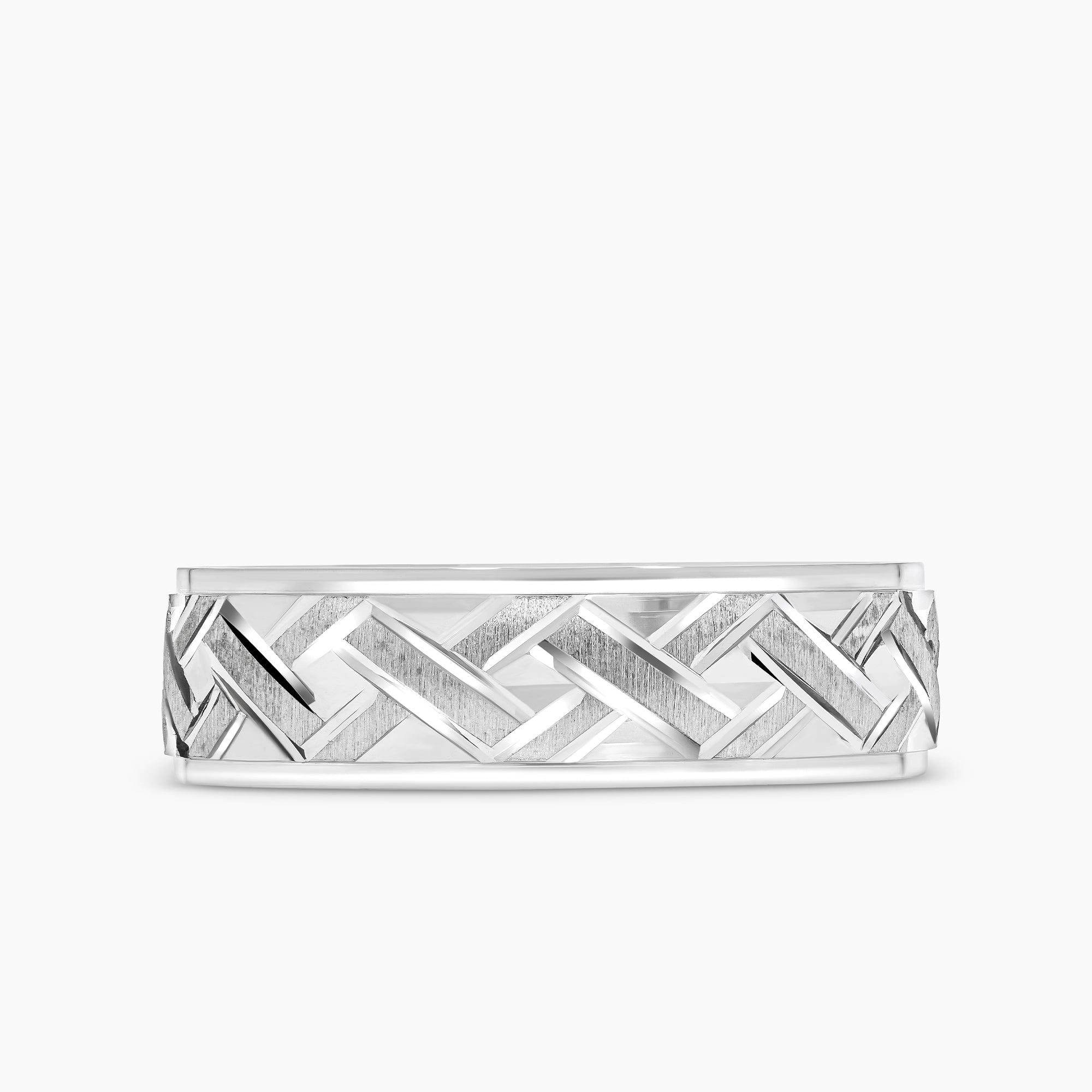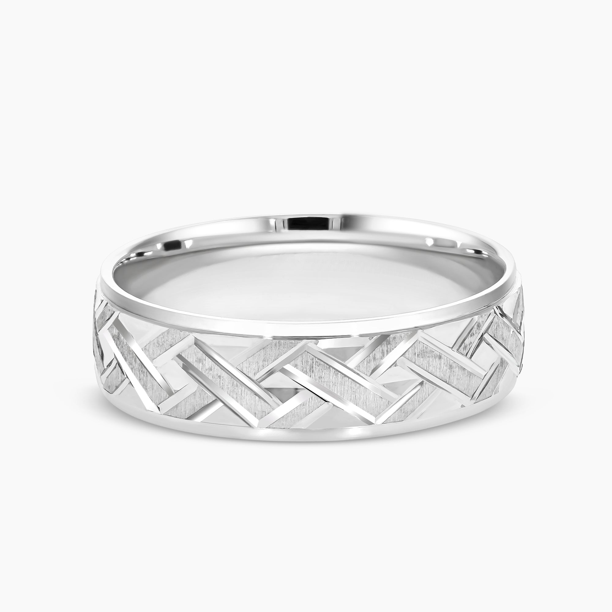 This 6mm wedding band in 14K white gold showcases refined craftsmanship with a distinctive weave finish that creates texture and dimension across the surface. The subtle interlacing pattern reflects light beautifully, offering a modern twist on a timeless design. Finished with a comfort-fit interior, this band is designed for both elegance and everyday wear—an enduring symbol of your commitment.