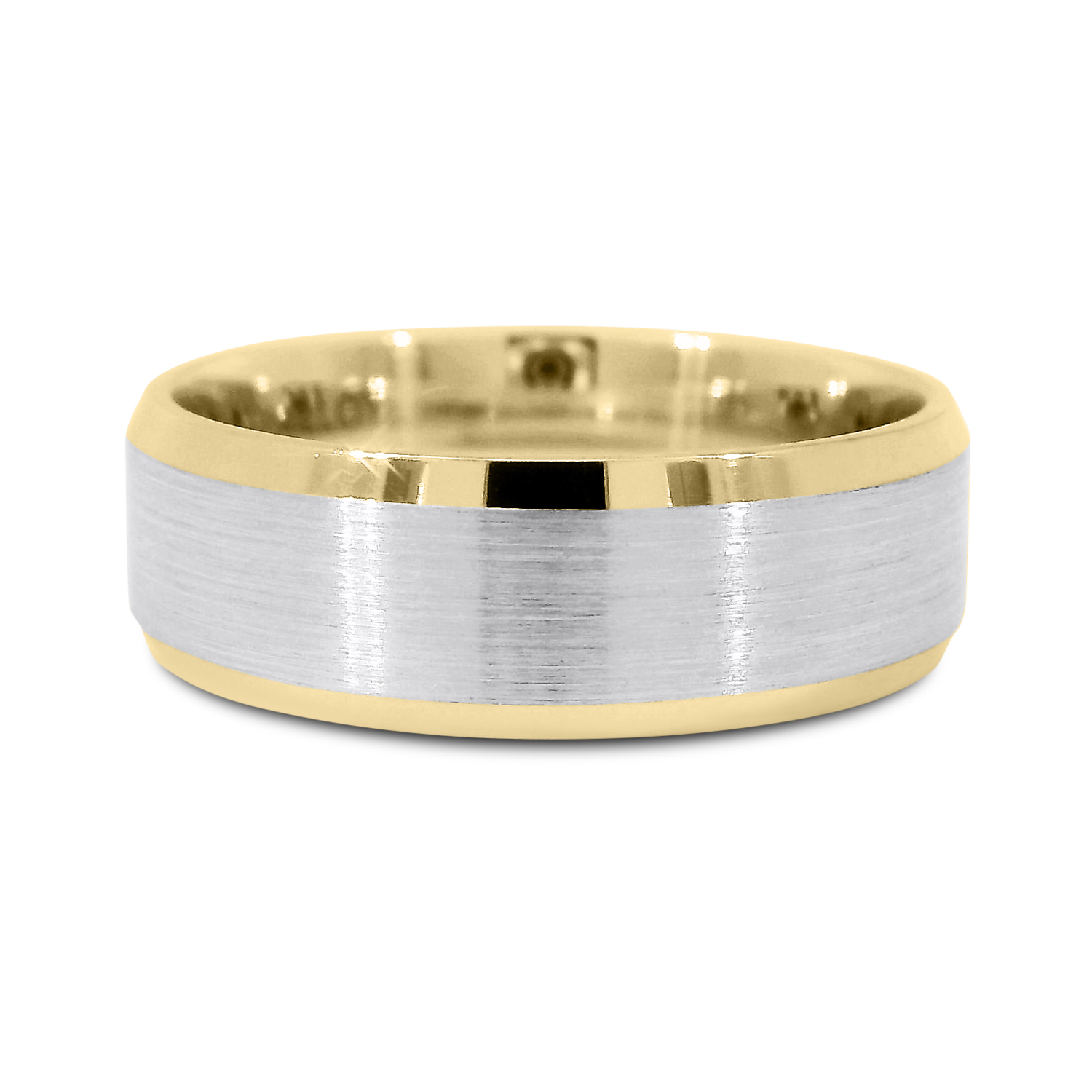 A distinguished wedding band combining contrast, craftsmanship, and comfort. The design features a two-tone metal contrast, with a softly brushed satin center that provides subtle texture and elegance. Gleaming beveled edges frame the band, offering sharp definition and a polished finish that catches light beautifully.