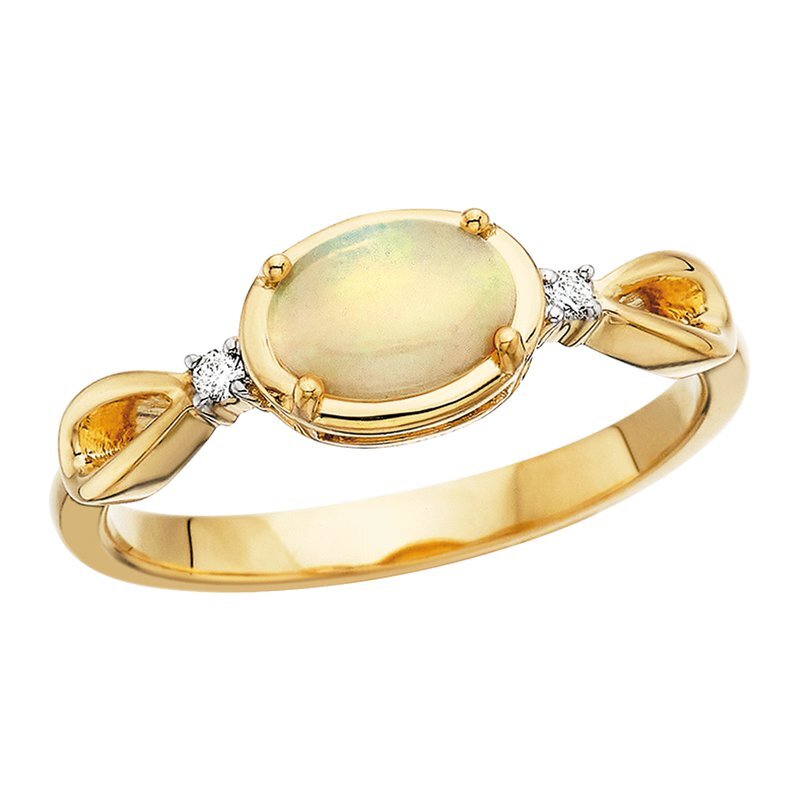 This refined oval Australian opal ring showcases a mesmerizing opal with vivid color play, complemented by 0.03 carats of delicate diamonds. Set in a classic band, the diamonds add a hint of sparkle that enhances the opal's natural beauty. A timeless and elegant piece for those who admire unique gemstones.