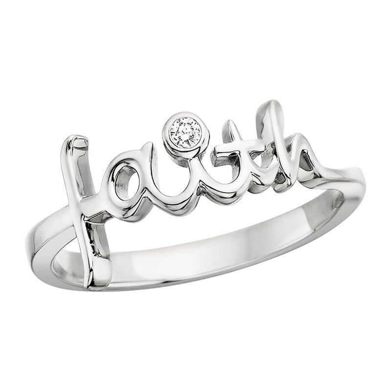 This sterling silver ring spells out “faith” in flowing script, highlighted with a single sparkling diamond accent. A meaningful little reminder of what matters most.