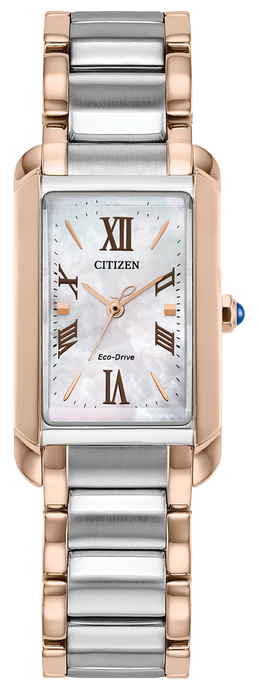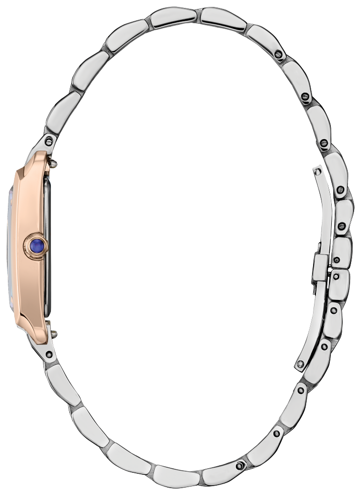 Classic lines and subtle sophistication make this latest piece to our women’s collection, the Citizen L Bianca, a charming addition of sustainable luxury. With a design inspired and celebrating feminine motifs in art deco, the distinctive silver- and rose gold-tone stainless steel timepiece features an elongated case shape and a subtle synthetic sapphire on its crown, creating a captivating look. A curved rectangular shape defines the watch’s 32.4mm silhouette, with a triple link bracelet rounding out the look. On its charming mother-of-pearl dial, alternating Roman and stick-style indices pair with a simple set of hands for a highly aesthetic style. This elegant timepiece is sustainably powered by any light with Citizen's proprietary Eco-Drive technology that never needs a battery. Water resistant to 50 meters. Caliber B035.