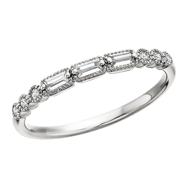 • Sleek and sophisticated, this 14K white gold band features an elegant combination of baguette and round diamonds, creating a striking interplay of shapes and sparkle. Perfect as a standalone statement or stacked with other rings, its timeless design adds a refined touch to any jewelry collection.
