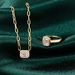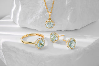 Aquamarine wrapped in a diamond halo, set in yellow gold, a perfect paring for your gift.