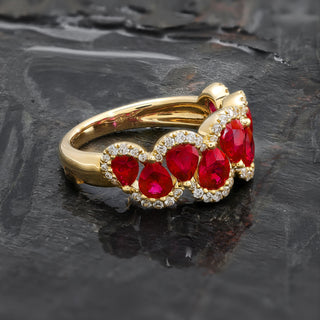 Vibrant rubies set in yellow gold with accent diamonds, create a striking contrast of deep red brilliance and timeless elegance. Bold, fiery, and full of character, this piece is a classic expression of passion and enduring beauty.