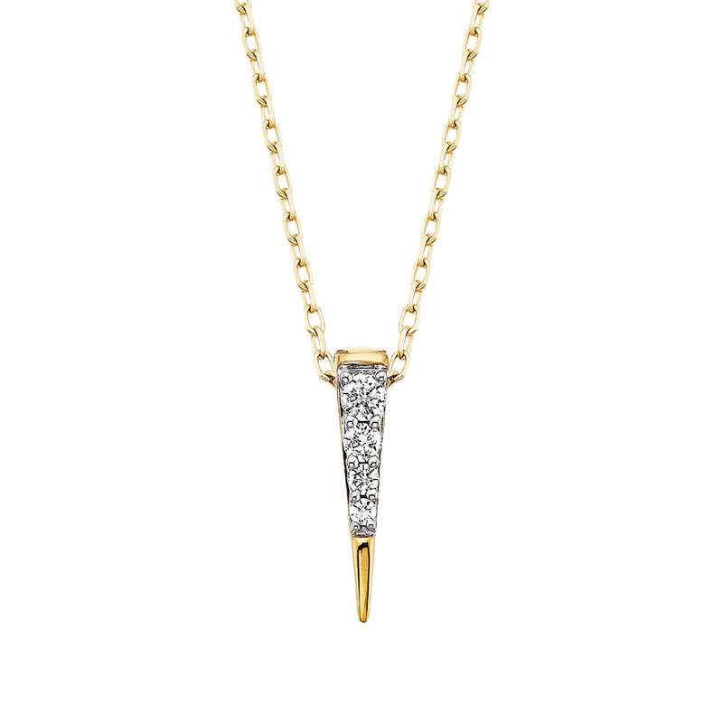 Bold and modern, this 10K yellow gold pendant features a striking spike design accented with brilliant diamonds. Its clean, edgy silhouette offers contemporary elegance, making it a standout piece for layering or wearing alone to add a touch of sparkle and attitude.