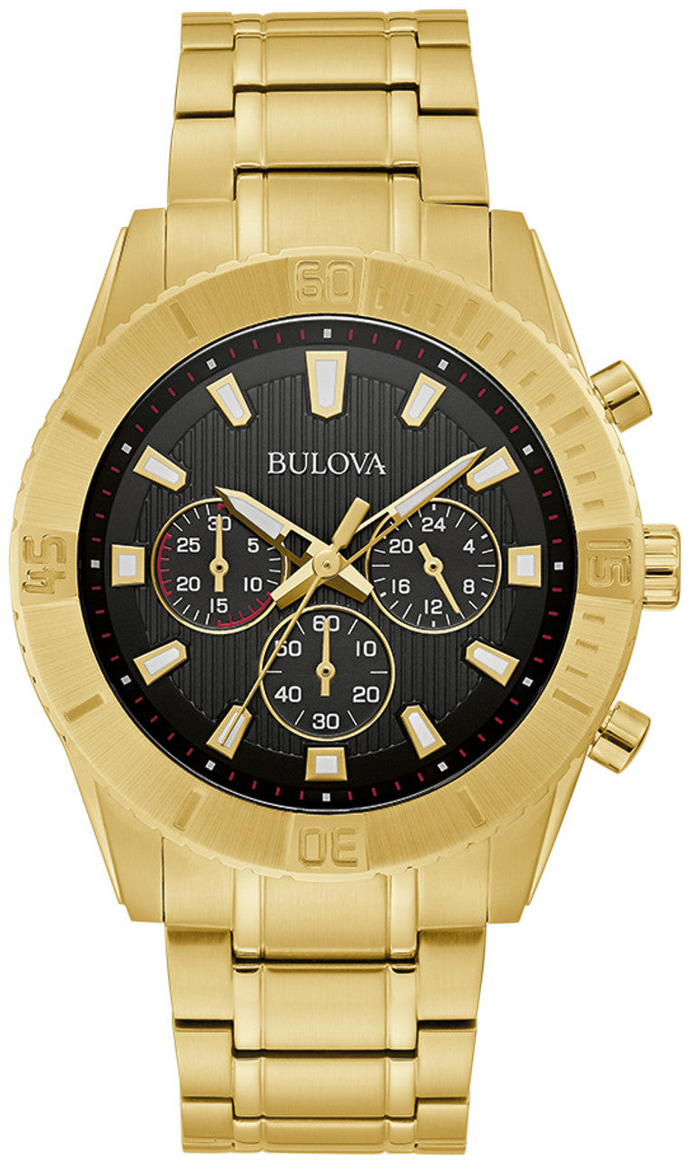 • This Bulova Classic blends sleek sport styling with dress-watch shine. The gold-tone stainless case and bracelet frame a deep black dial with applied markers and luminous hands for quick legibility. Chronograph sub-dials add function and attitude, while the solid bracelet and secure foldover clasp keep it comfortable from work to weekend.