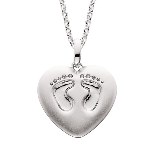 This sterling silver heart pendant features tiny raised baby footprints, creating a sweet keepsake for moms and moms-to-be. Perfect for wearing close to your heart every day.