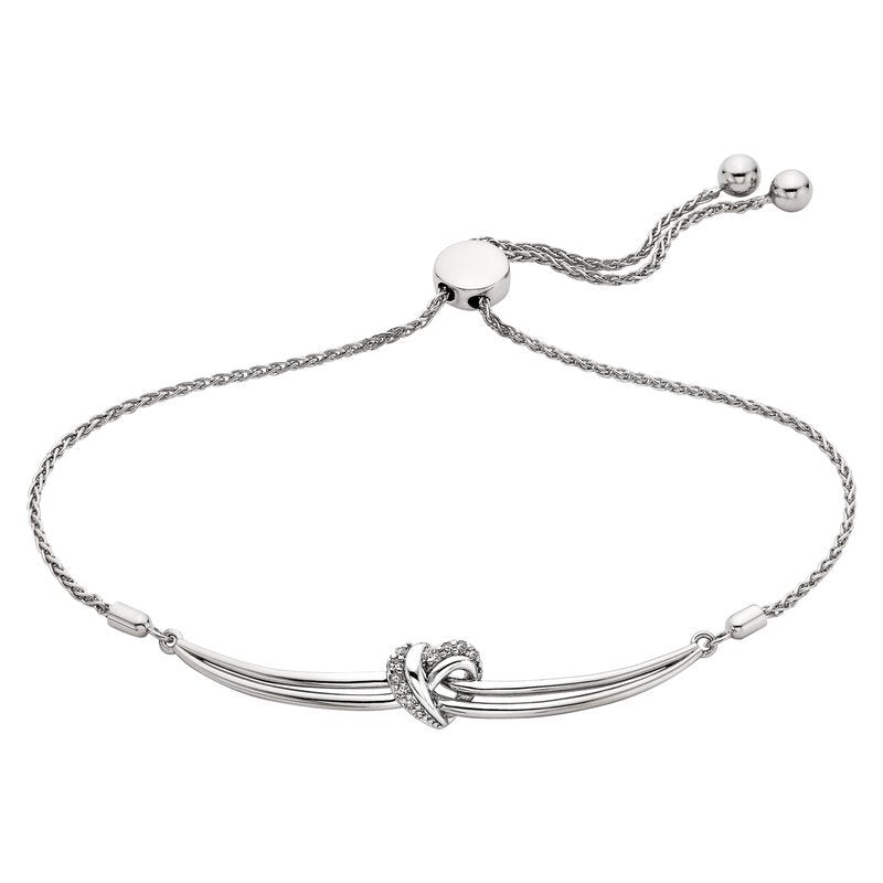 • This sterling silver bolo bracelet features a sleek curved bar wrapped with a sparkling CZ heart knot at the center. Finished with an adjustable slider, it’s an easy, everyday way to wear a little love on your wrist