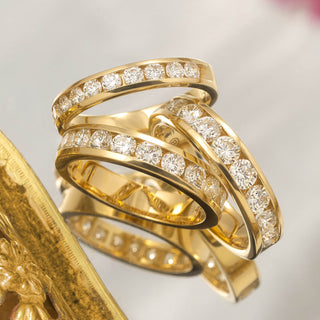 Channel set diamond wedding bands feature a clean, streamlined design with diamonds set flush for a smooth, elegant look. This secure setting enhances each diamond's brilliance while providing lasting comfort and durability.